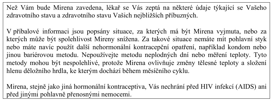 Mirena není metodou první volby pro mladé ženy, které ještě nebyly těhotné, ani pro ženy po přechodu, u kterých dochází ke zmenšování dělohy.