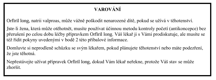 -      Jste-li žena, která může otěhotnět, nesmíte užívat přípravek Orfiril long k léčbě epilepsie, pokud nepoužíváte účinnou metodu kontroly početí (antikoncepci) během celé doby léčby přípravkem Orfiril long. Nepřestávejte užívat přípravek Orfiril long ani používat antikoncepci bez porady se svým lékařem. Váš lékař Vám poskytne další doporučení (viz níže v části „Těhotenství, kojení a plodnost – Důležitá rada pro ženy“).