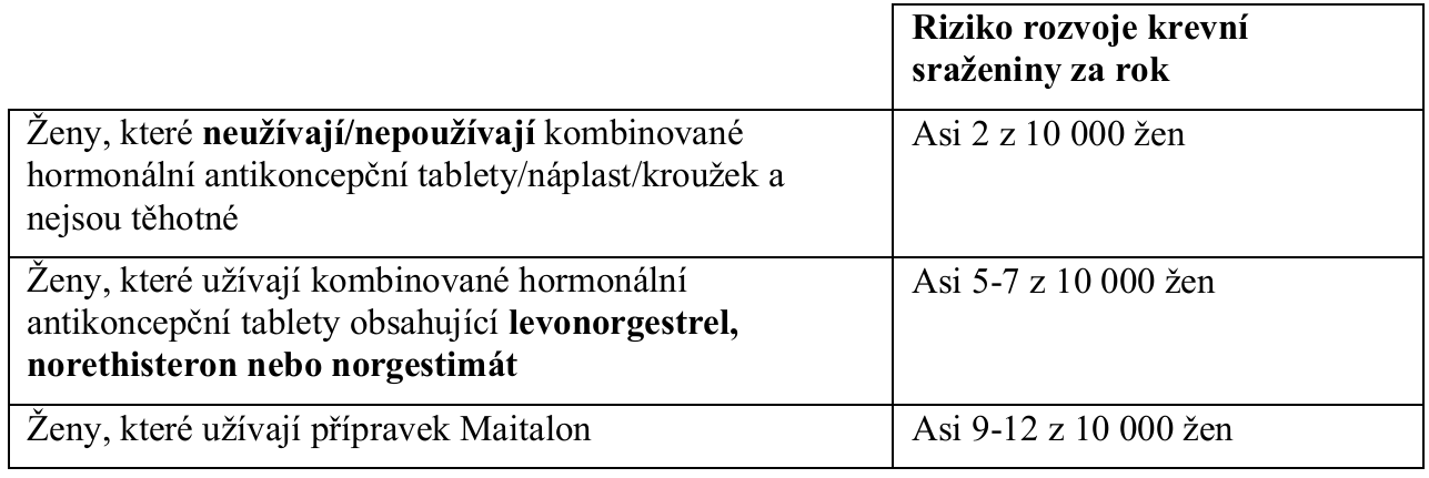 - Z 10 000 žen, které používají kombinovanou hormonální antikoncepci obsahující drospirenon, jako je přípravek Maitalon se asi u 9 až 12 žen vyvine krevní sraženina během jednoho roku.